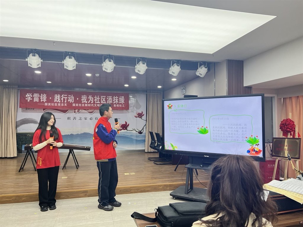 志愿服务小分队首先来到国宾社区新时代实践站,听取国宾社区志愿服务队举办的雷锋精神主题宣讲。
