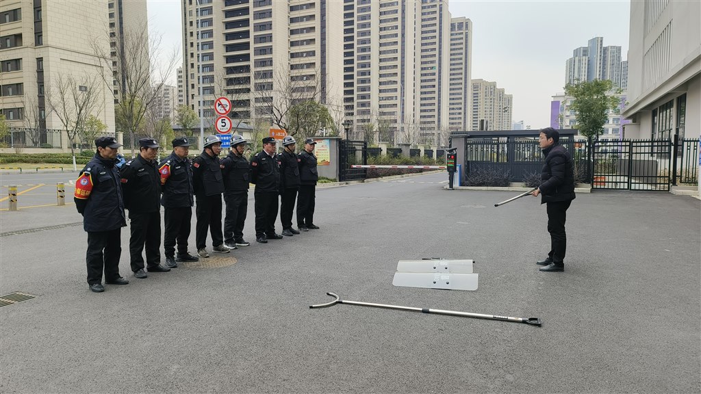 首先,开元物业负责人对安保人员详细讲解了防暴盾牌、防暴叉、棍等防暴器材的使用方法。
