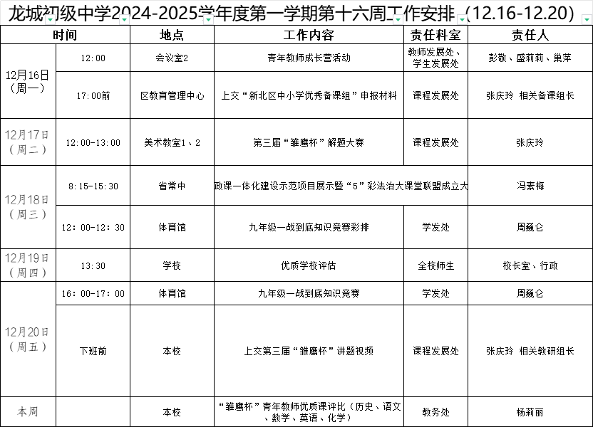 龙城初级中学2024-2025学年度第一学期第十六周工作安排(12.16-12.20)