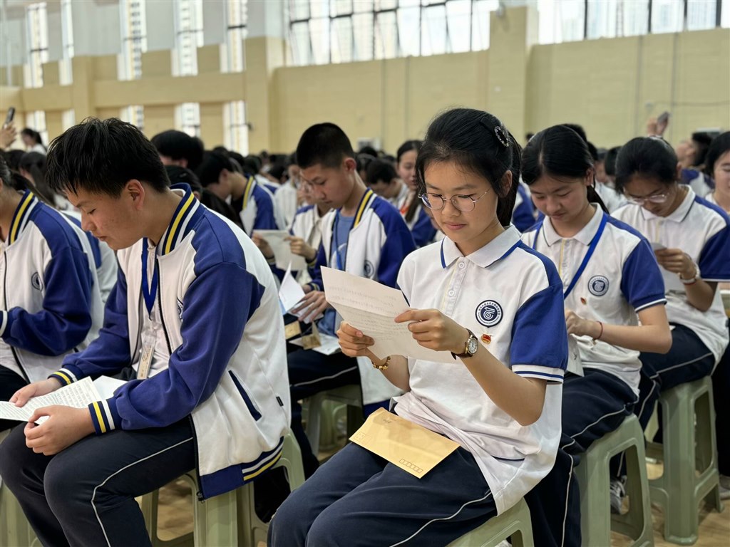 “纸短情长,字字牵挂”,家长代表胡珀樘妈妈的发言将活动推向温情高潮。她以“夜色黑凉,前行必有曙光”勉励少年勇敢追梦,真挚的话语引发共鸣。随后,全体学生拆阅父母亲笔书信。背景音乐轻柔流淌,许多学生低头拭泪,信纸上的一笔一画,凝聚着父母十四年的陪伴与期许。